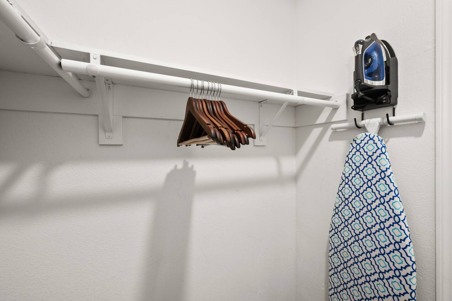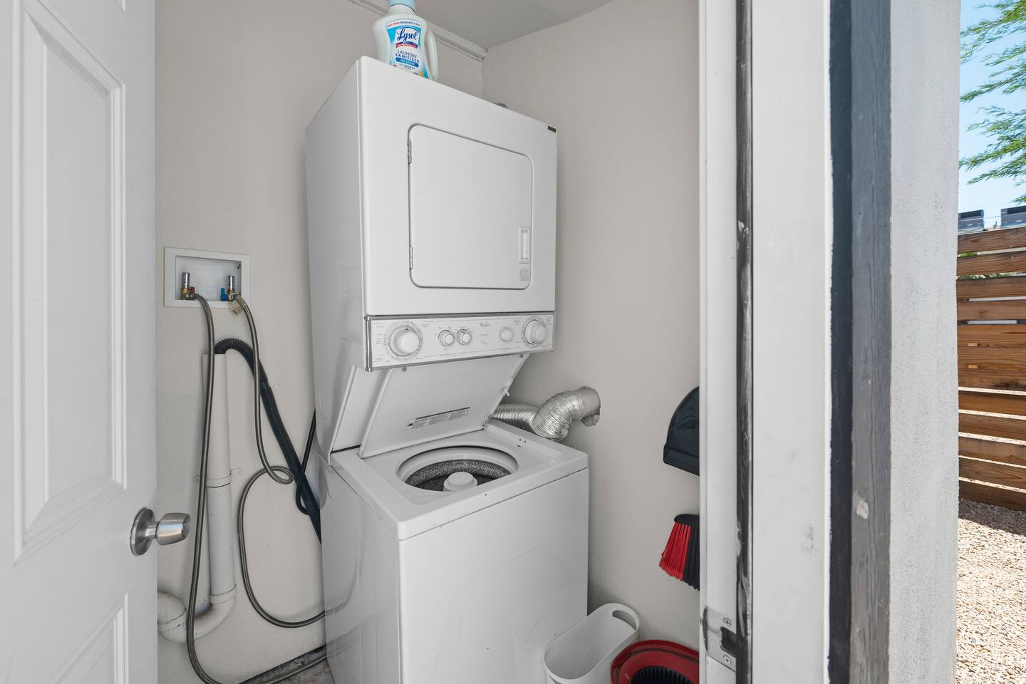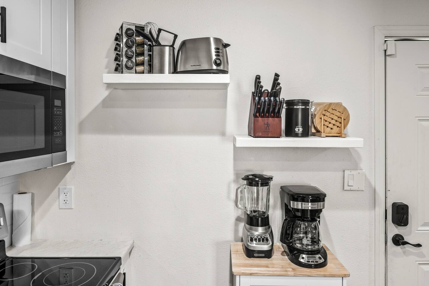 A comfortable 10 inch king-sized memory foam mattress awaits you in the bedroom, and a queen-size memory foam sleeper sofa is also available in the living room. A Pack 'n Play and high chair are available upon request. The kitchen has spices, pots, pans, baking dishes, and utensils, and appliances include a full-sized refrigerator, full-size oven and stove, dishwasher, coffee maker, toaster, and blender. You have your own stacked washer and dryer accessible from your patio right off the bedroom.