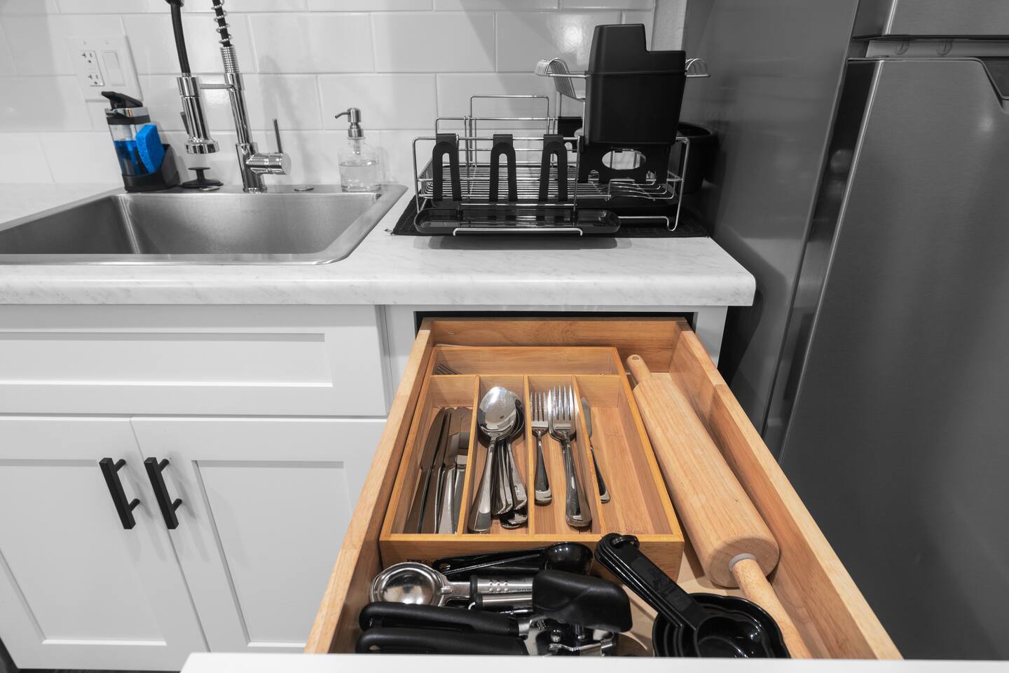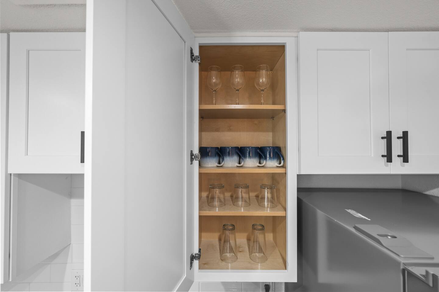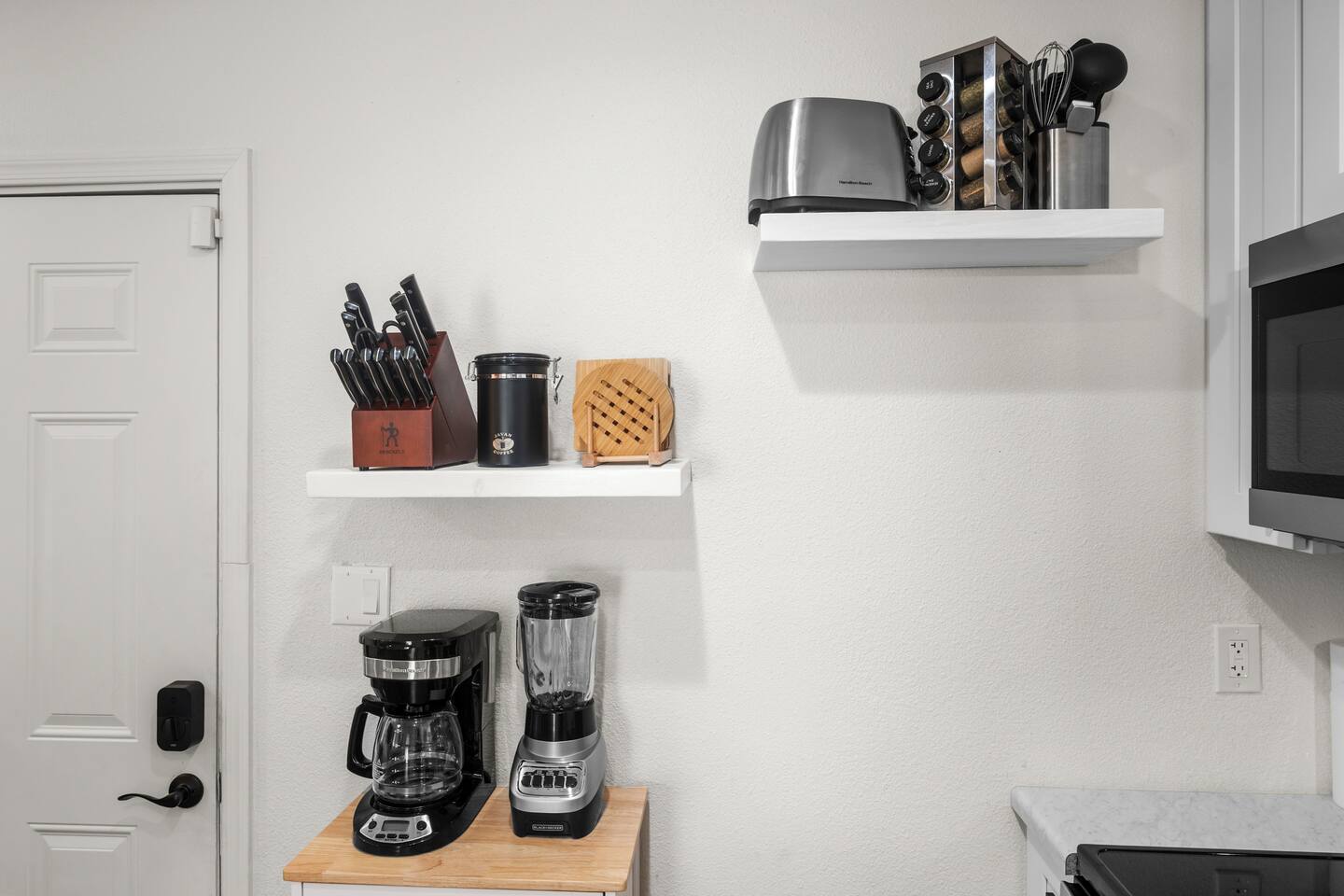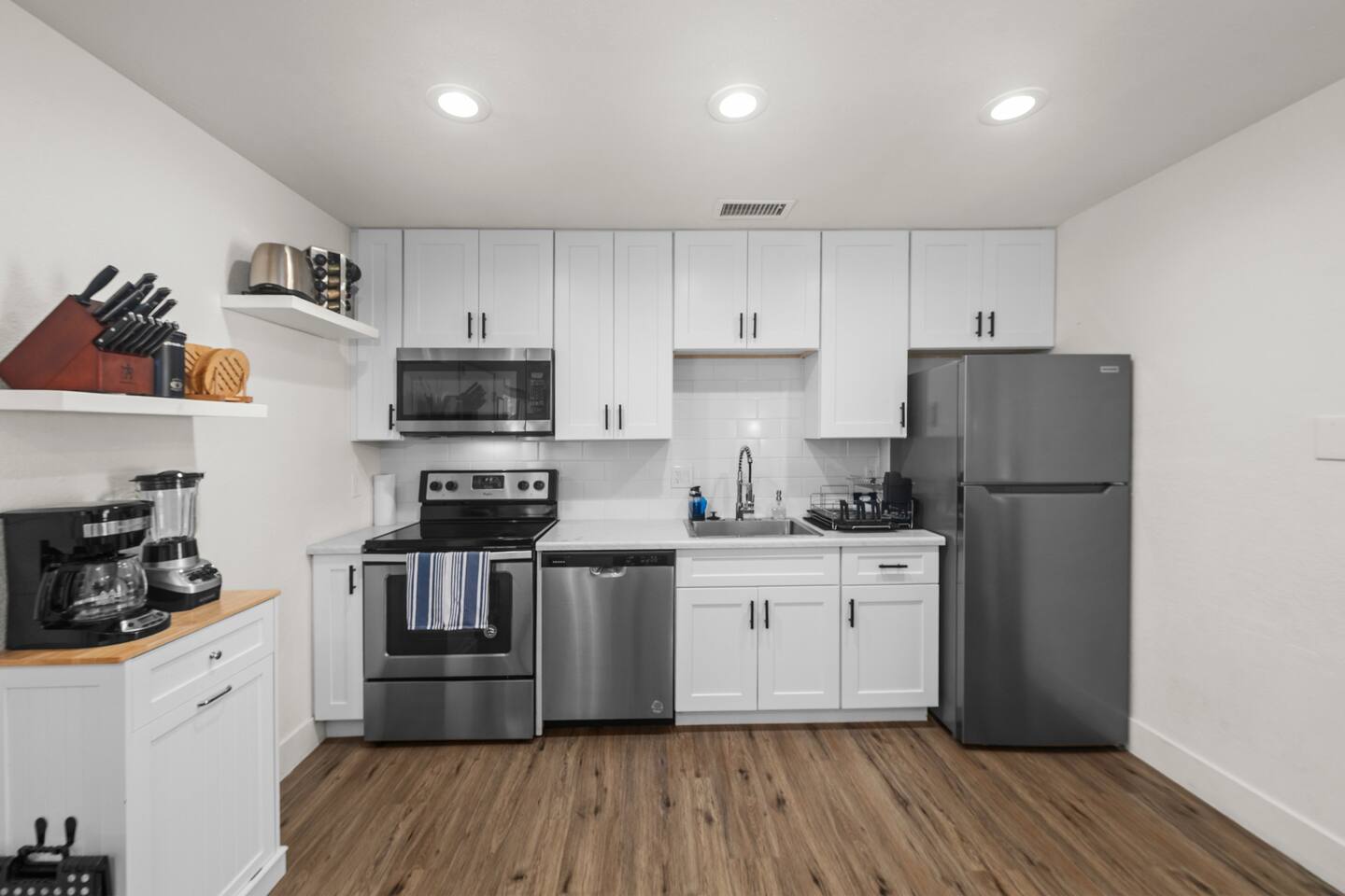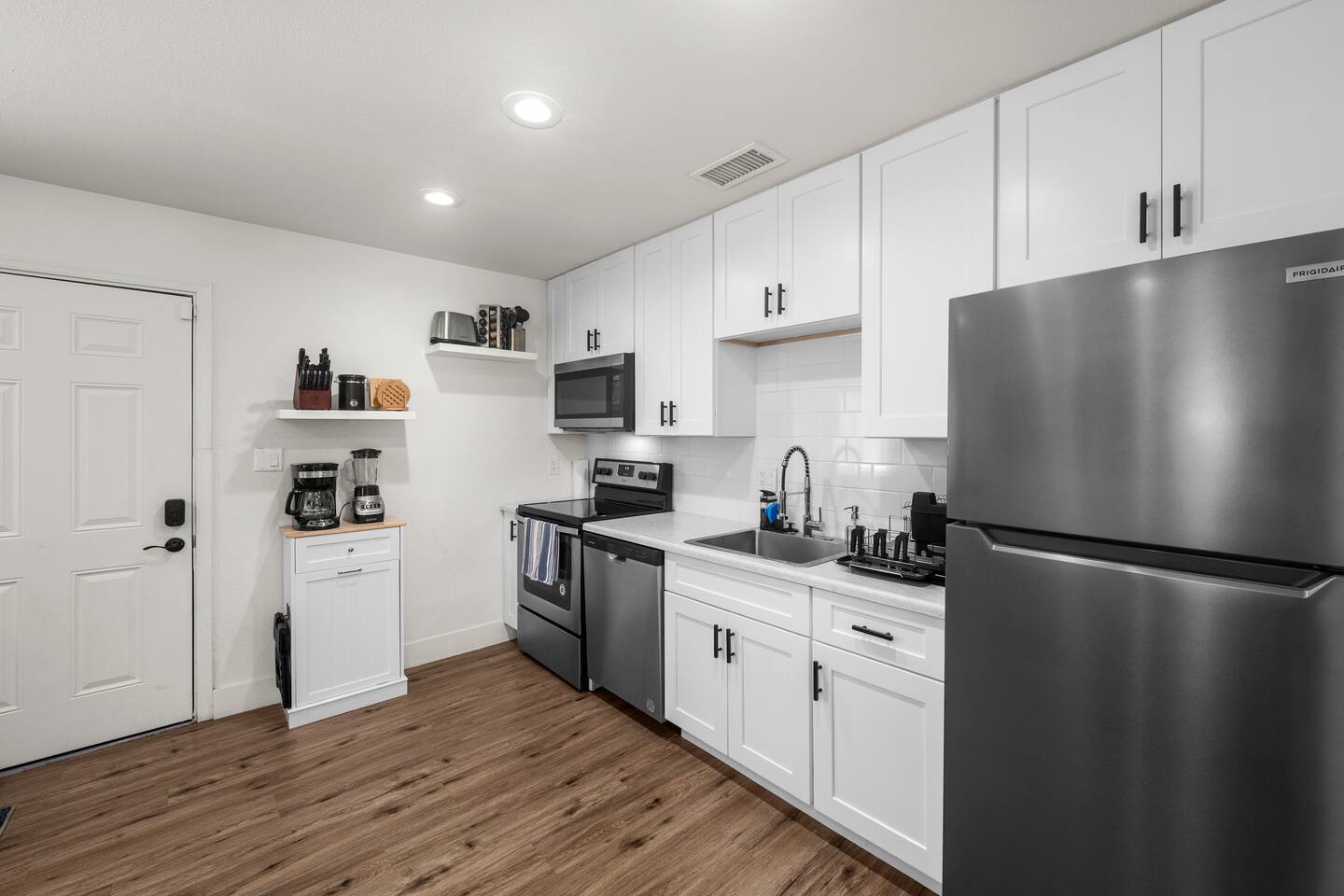 A comfortable 10 inch king-sized memory foam mattress awaits you in the bedroom, and a queen-size memory foam sleeper sofa is also available in the living room. A Pack 'n Play and high chair are available upon request. The kitchen has spices, pots, pans, baking dishes, and utensils, and appliances include a full-sized refrigerator, full-size oven and stove, dishwasher, coffee maker, toaster, and blender. You have your own stacked washer and dryer accessible from your patio right off the bedroom.