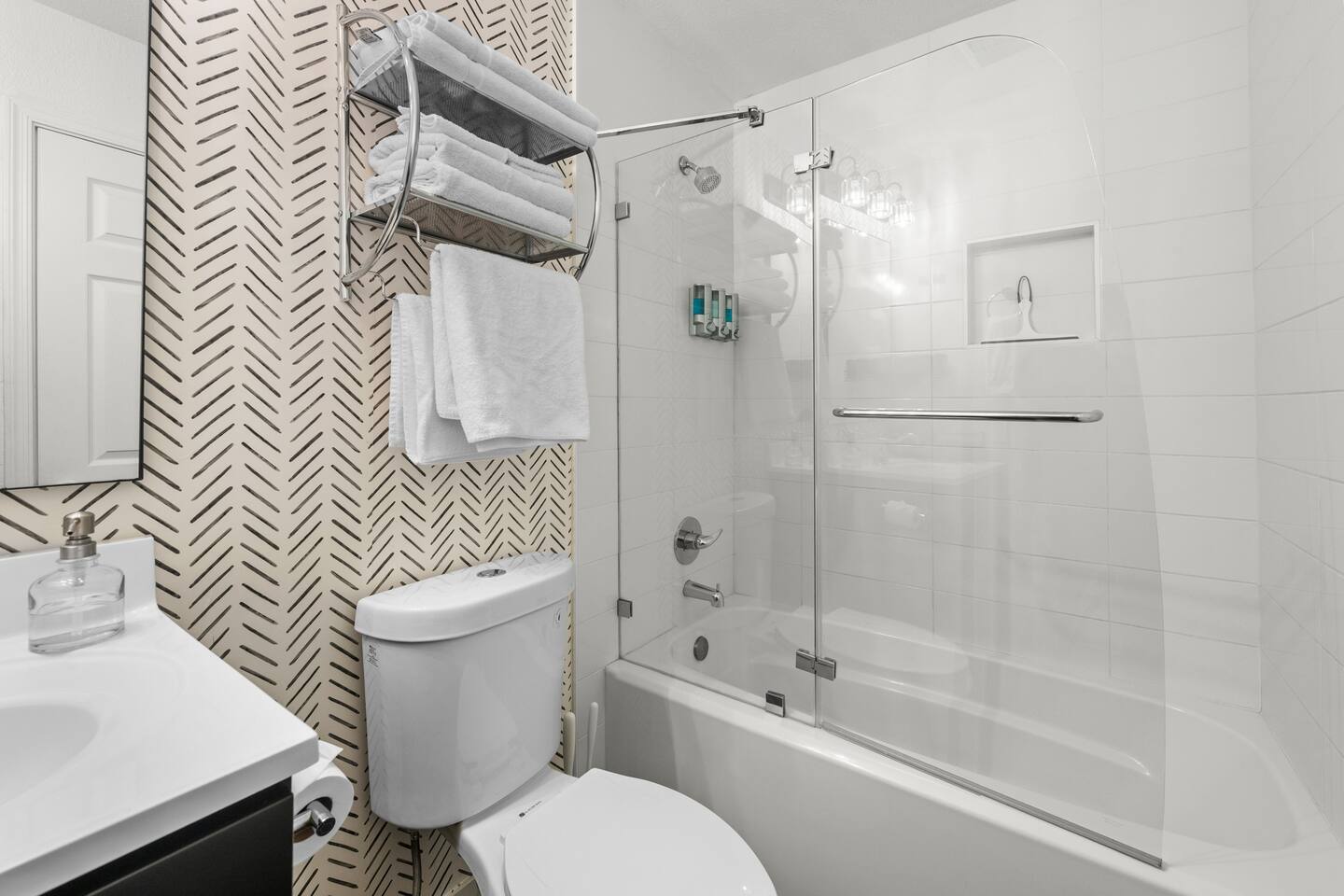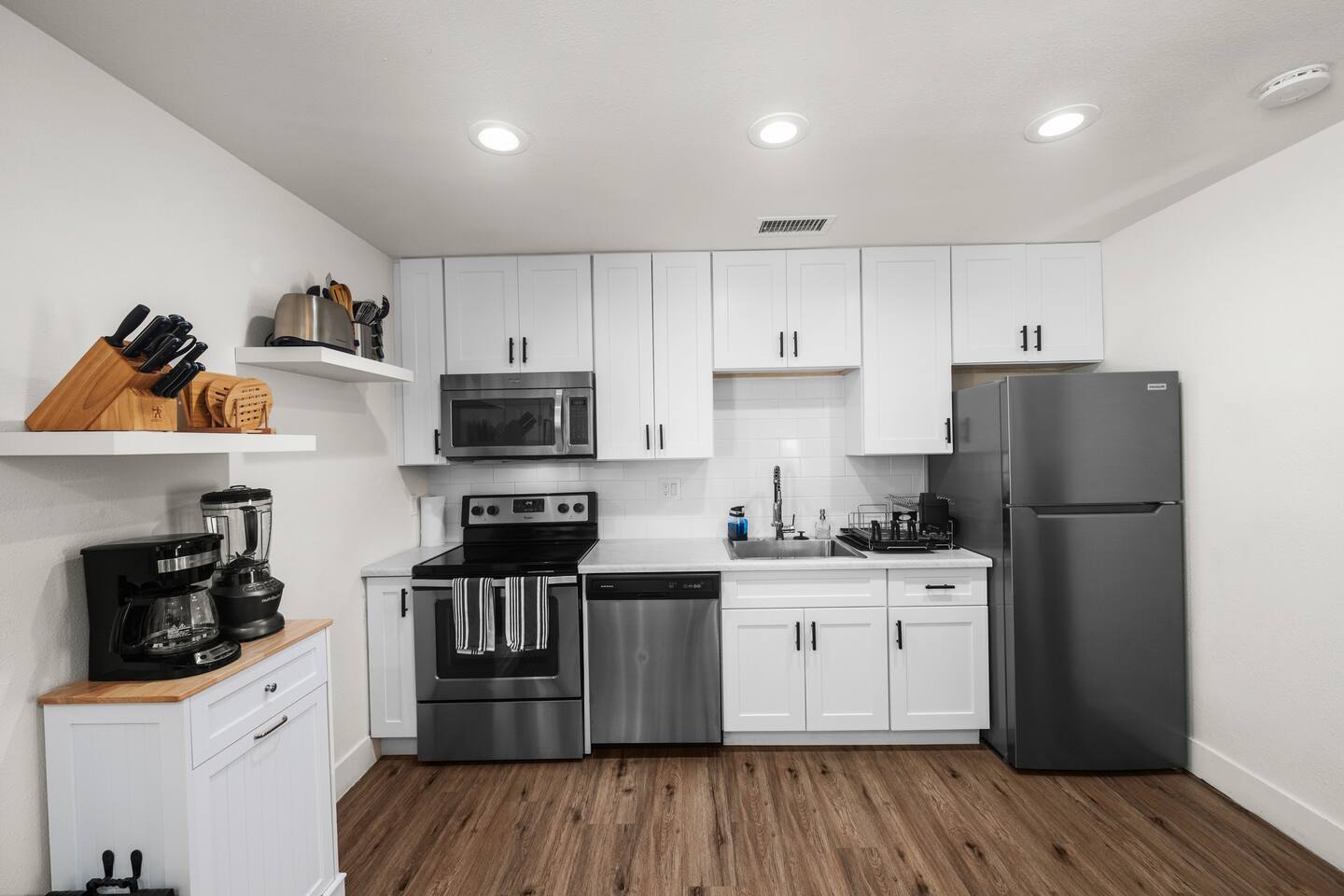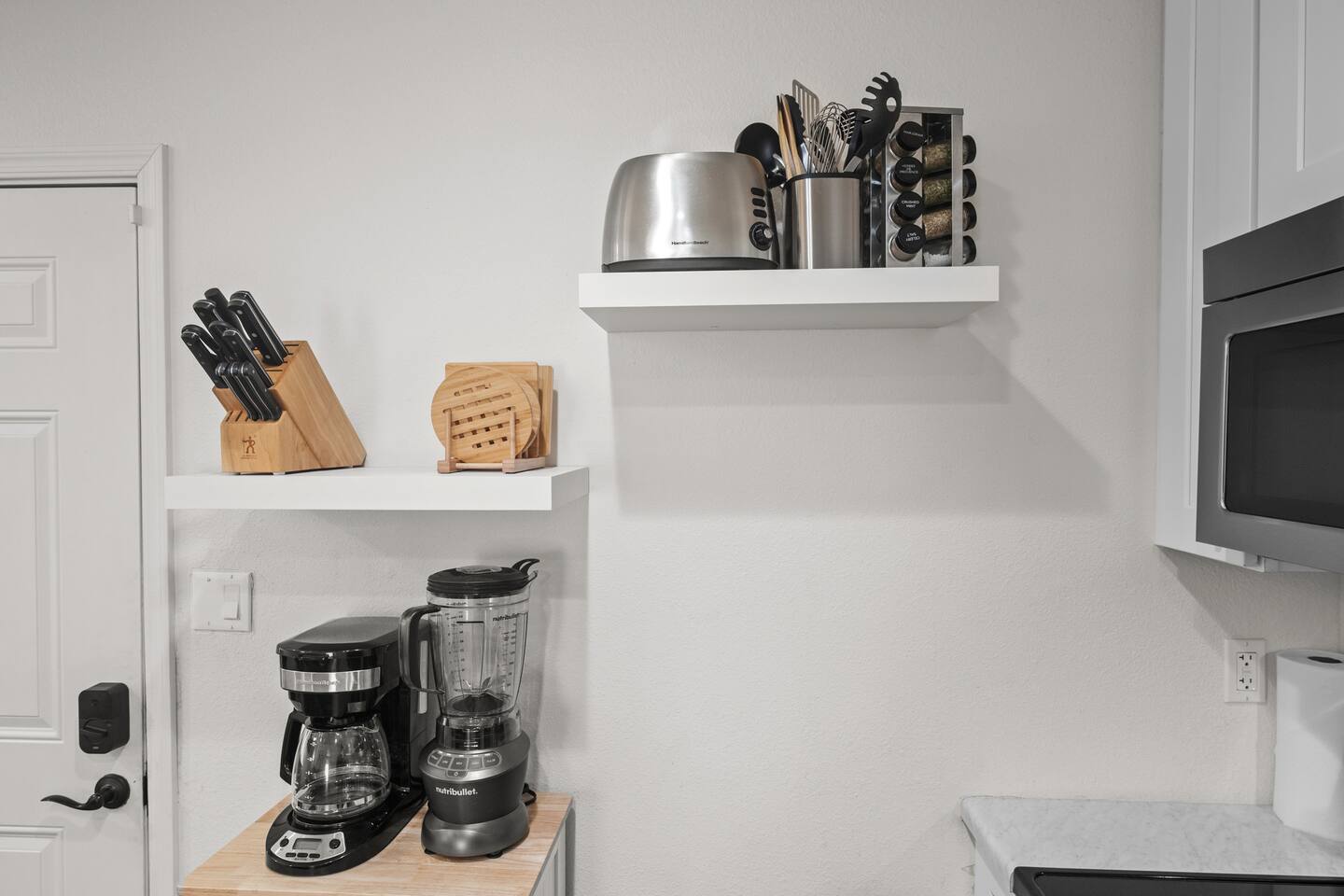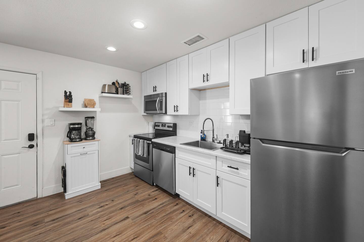A comfortable 10 inch king-sized memory foam mattress awaits you in the bedroom, and a queen-size memory foam sleeper sofa is also available in the living room. A Pack 'n Play and high chair are available upon request. The kitchen has spices, pots, pans, baking dishes, and utensils, and appliances include a full-sized refrigerator, full-size oven and stove, dishwasher, coffee maker, toaster, and blender. You have your own stacked washer and dryer accessible from your patio right off the bedroom.